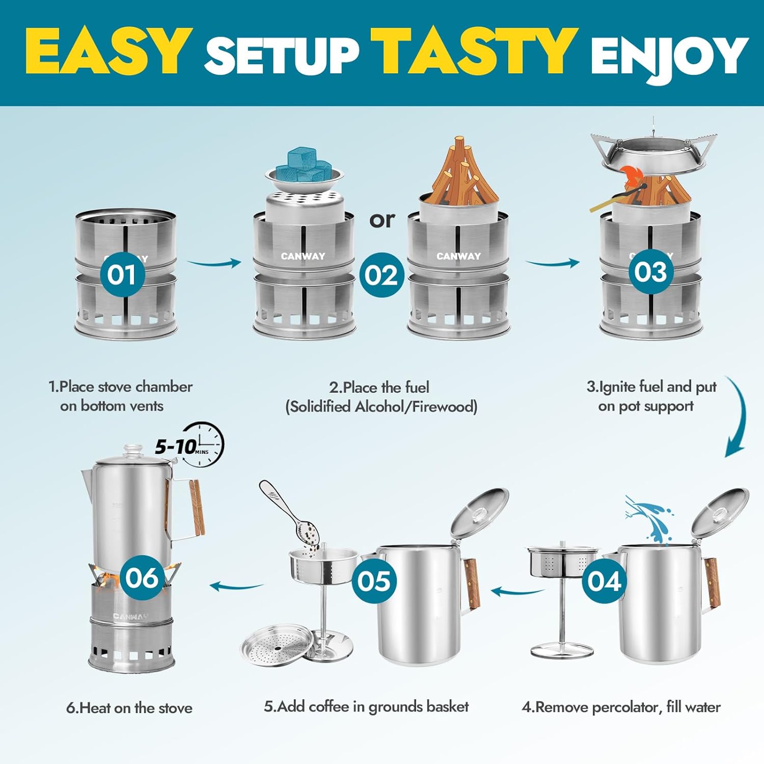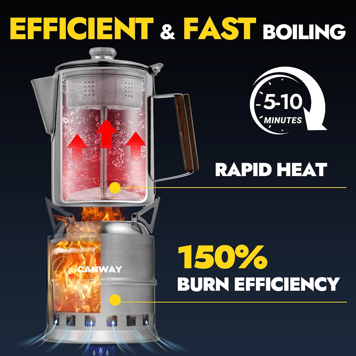 - HIGH EFFICIENCY & RAPID BOILING: The camping wood stove boasts an optimized design that promotes excellent airflow, ensuring high combustion efficiency and concentrated heat. The included camping percolator coffee pot heats water rapidly, allowing it to boil quickly and conserve both fuel and time. Enjoy hot beverages efficiently, even while in the great outdoors
