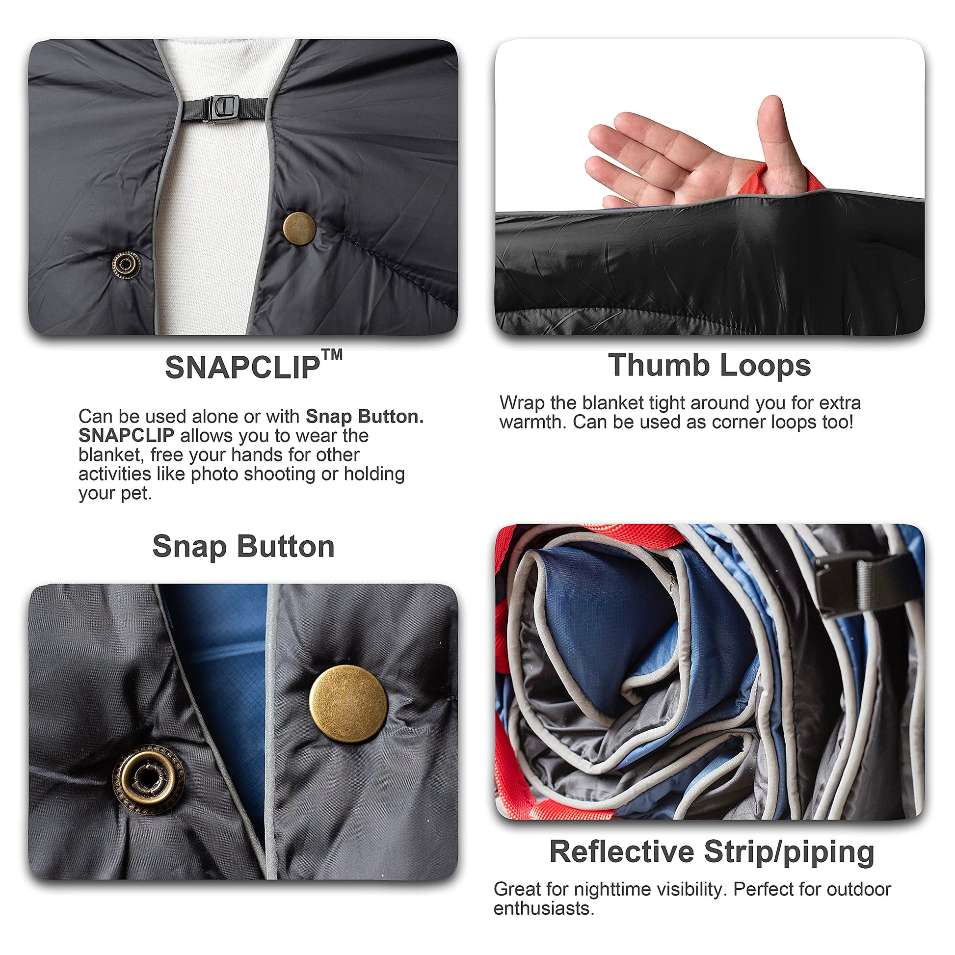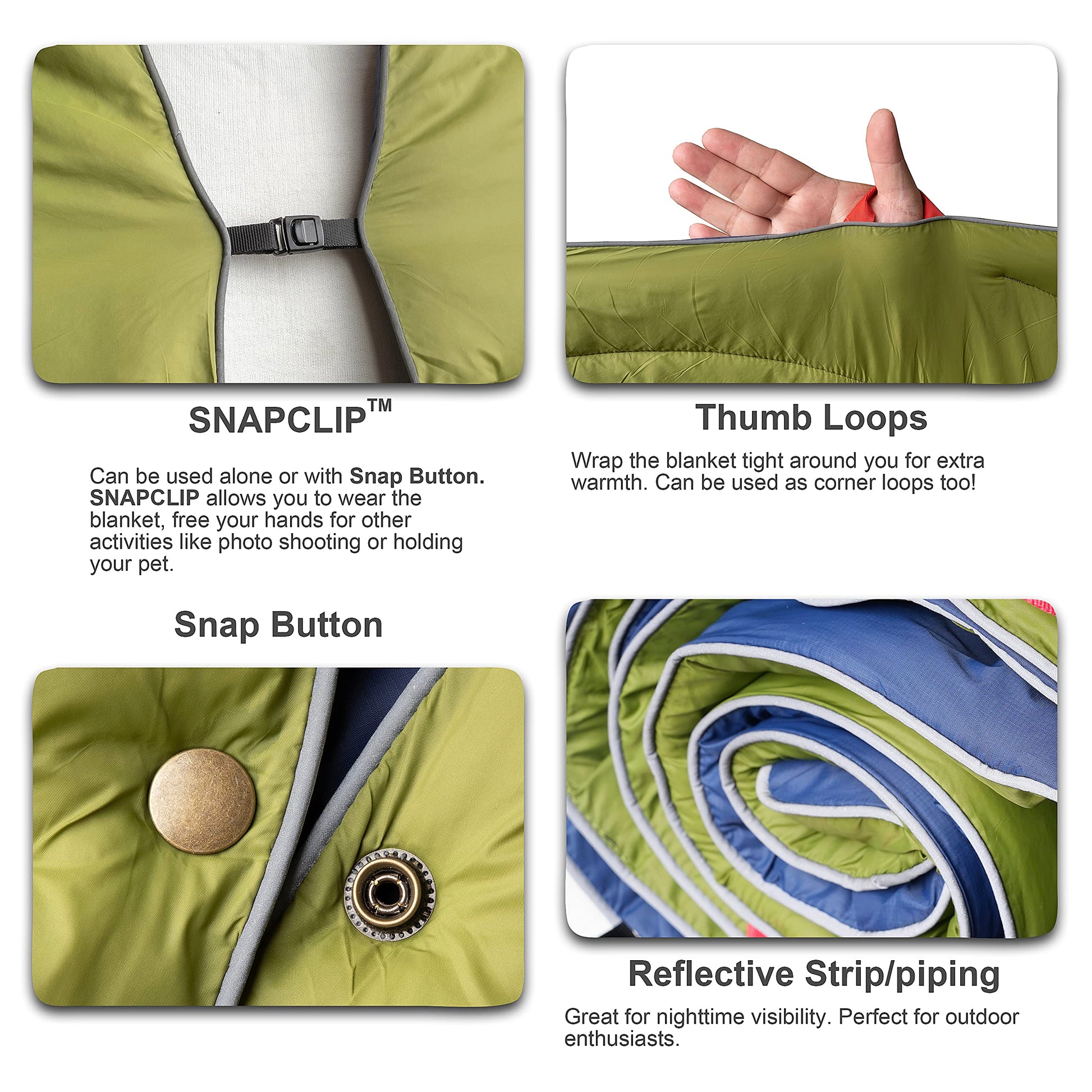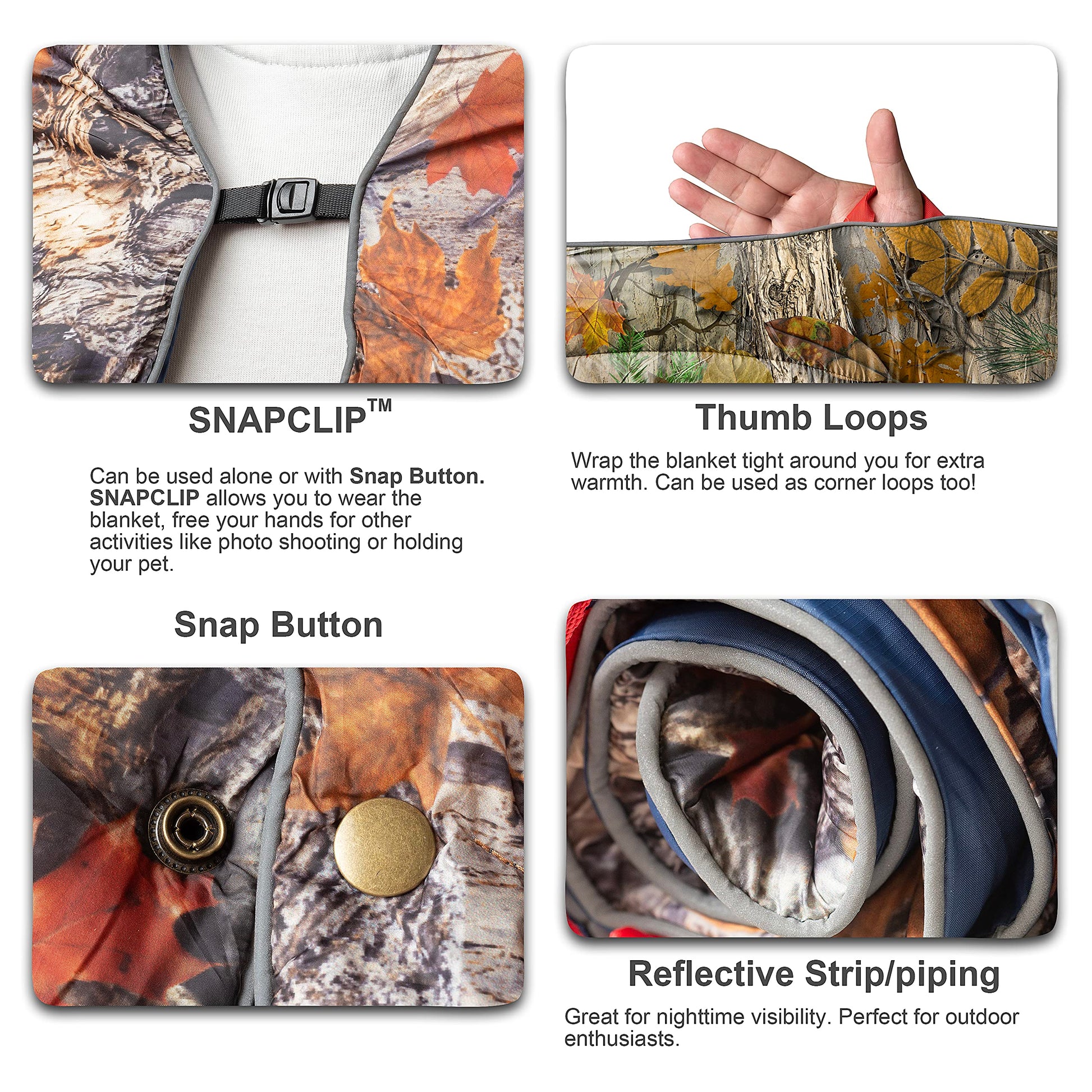 - 🎯 WEARABLE LIKE PONCHO LINER 🎯 The distinguished SNAPCLIP allows you to wear the blanket like a woobie, free your hands for other activities like photo shooting, preparing food, holding your pet while staying warm. The Snap Button is a surplus and more convenient.