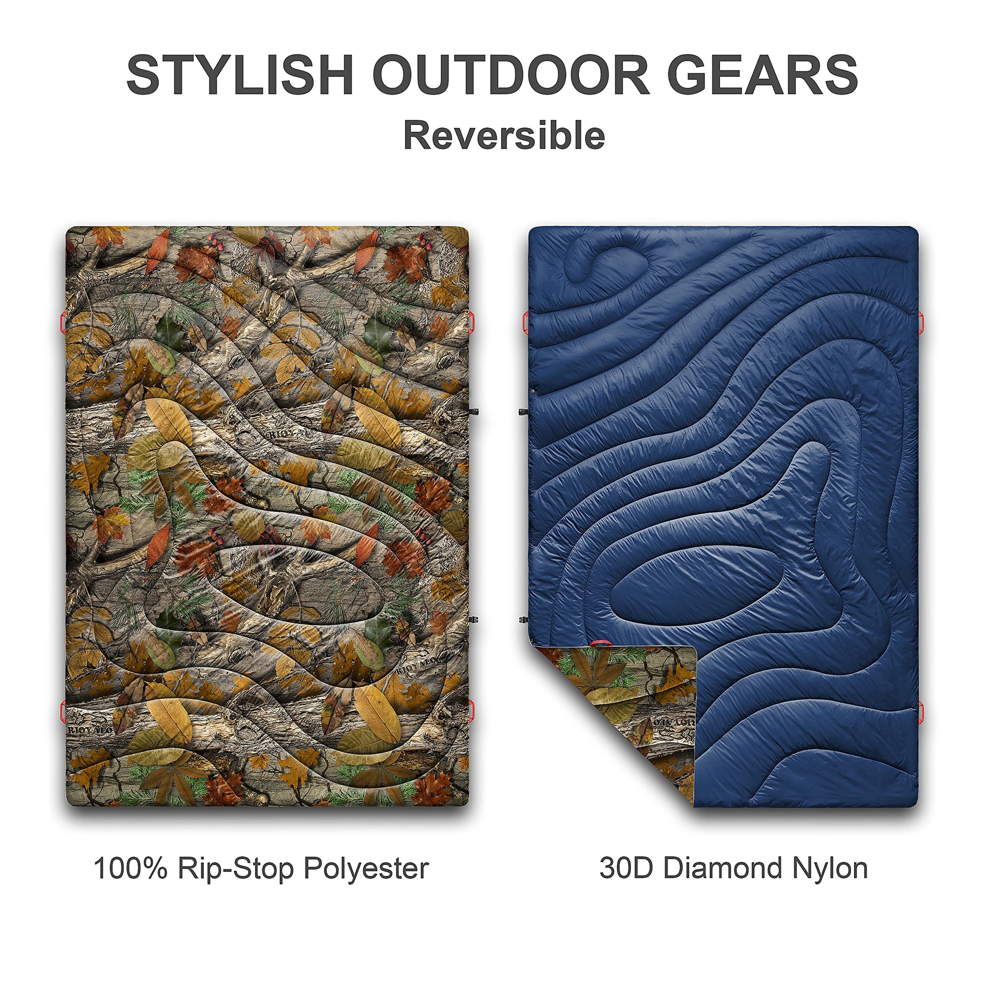 RIOYALO ECO-SILKTM Puffy Camping Blanket - Forest Camo 🎁 ECOSILK PUFFY BLANKET 🎁 This stylish blanket is a perfect gift for anyone who loves camping, hiking, backpacking and outdoor recreation activities. It is thermal insulated. It's a water resistant and tear resistant blanket that you can bring to anywhere. 💫 LIGHTWEIGHT & PACKABLE 💫 Measuring 55” X79” and less than 2 LBs, It is ultralight and highly portable when packing into the compact 6”X15” rolltop stuff sack comes with. It can also be used as car blankets or lap blankets too. 🎯 WEARABLE LIKE PONCHO LINER 🎯 The distinguished SNAPCLIP allows you to wear the blanket like a woobie, free your hands for other activities like photo shooting, preparing food, holding your pet while staying warm. The Snap Button is a surplus and more convenient. 💫 THERMAL INSULATION 💫 Light-weighted, fluffy, and cotton-like feeling, ECO-SILK cotton synthetic fiber provides this packable blanket the best combination of warmth, comfort and weight. 💫 WATER RESISTANT & TEAR RESISTANT 💫 The 30D diamond nylon shell with DWR treatment provides superior strength and exceptional weatherproof features for this warm blanket. 🎯 THUMB LOOPS 🎯 Use them to wrap the blanket tight around you for windproof and extra warmth. They can be used as corner loops too. 🎯 REFLECTIVE STRIP 🎯 Great for nighttime visibility. Perfect safe feature for outdoor enthusiasts. 🎈 EASY CARE 🎈 It is machine washable. Wash it cold and hang dry or tumble dry low.