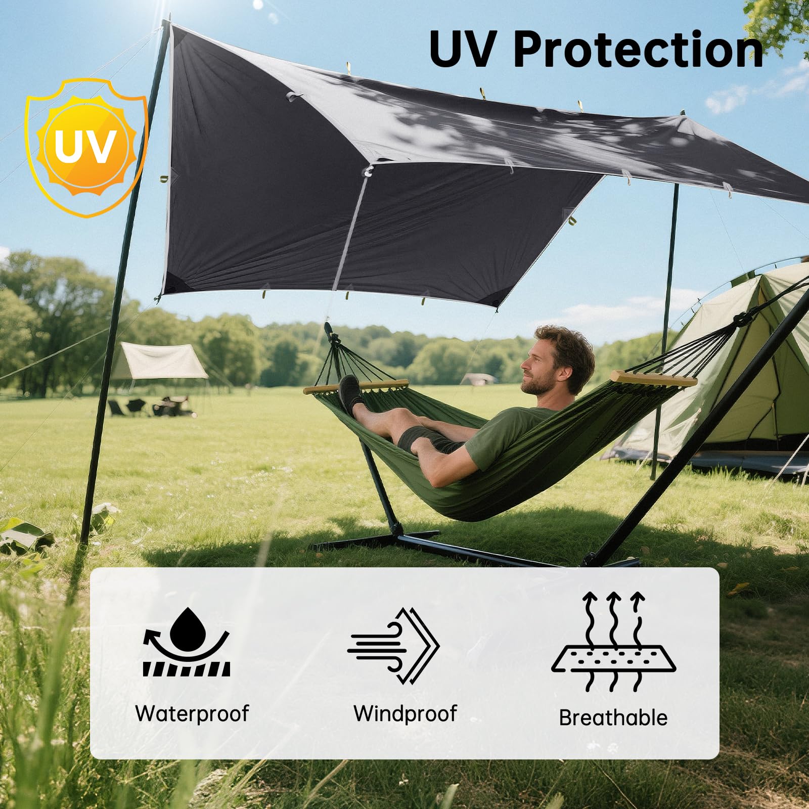 - ACCESSORIES & SIMPLE TO OPERATE - Comes with everything of survival backpacking items: 1 hammock rain fly, 4 nylon guy lines with tensioners and 1 stuff sack. Rectangle shelter with 19 guy points and 5 strengthen grommet points which gives you the most coverage. Easy to set up into ground sheet and hammock shelter to avoid wind and rain