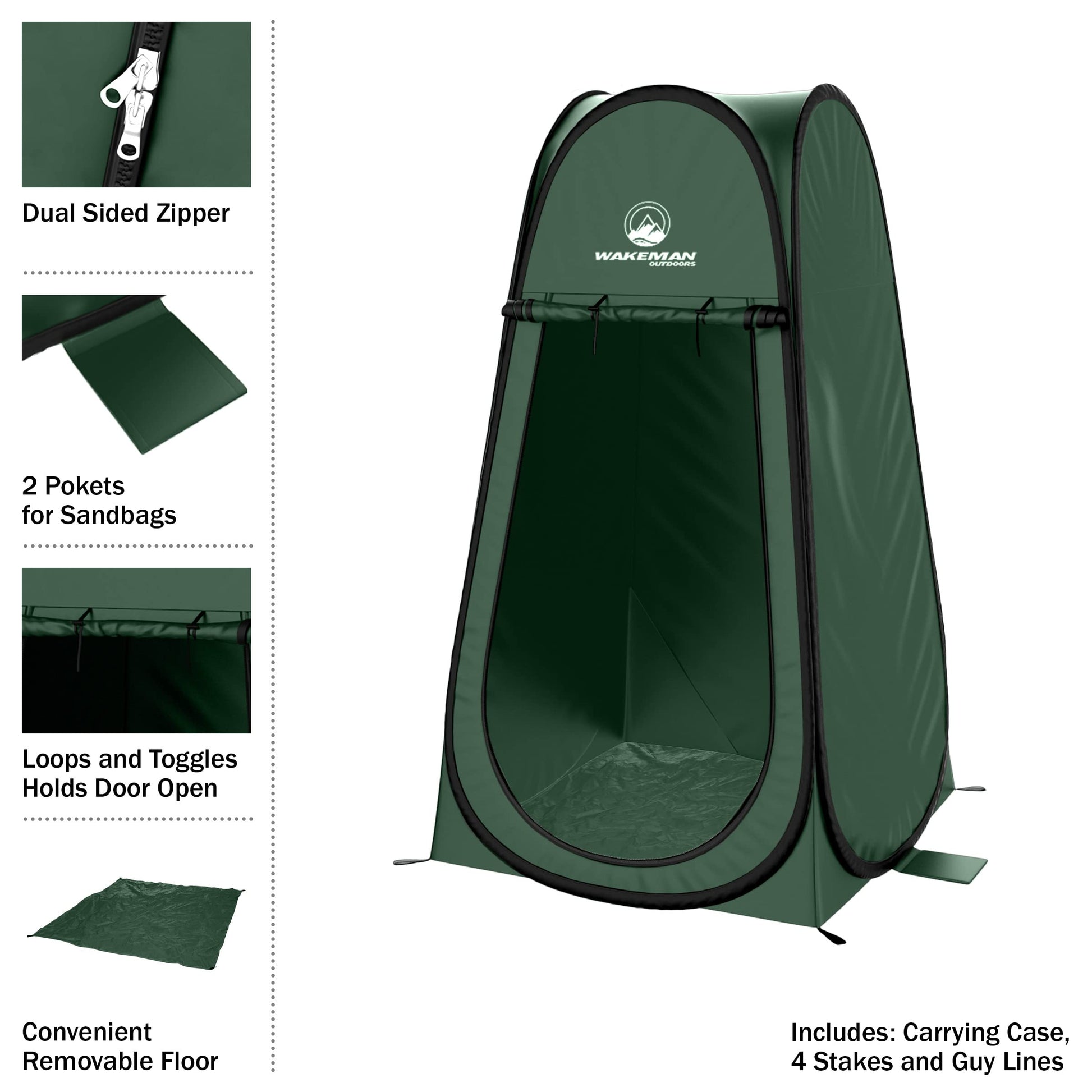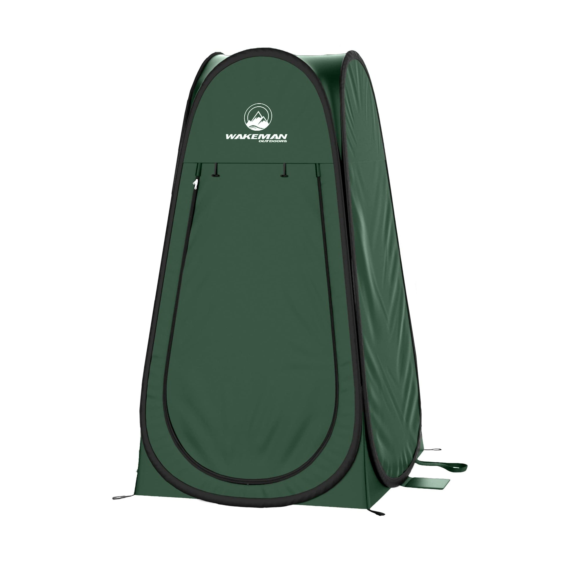 Enjoy on-the-go privacy by adding this Portable Camping Shower Tent by Wakeman Outdoors to your camping accessories. Perfect for use as a changing tent, shower, or camping bathroom, this pop up tent with a removable bottom makes a great addition to your road trip essentials or camping gear, plus it works great as a privacy tent for dance recitals, sporting events, or conventions. This easy-to-use pop up changing tent automatically sets up in seconds, and features a dual sided zippered door, 4 stakes and guy lines, 2 sewn-in pockets for sandbags, and a convenient carry bag for ultimate portability. IMPORTANT: Wakeman Outdoors is committed to providing the consumer with the absolute best price and value on all of our products. NOTE: This is an exclusive product of Wakeman Outdoors and ONLY Shower Tents for Camping by Wakeman Outdoors are GUARANTEED to be genuine. Avoid buying counterfeit products and transacting with unauthorized sellers.