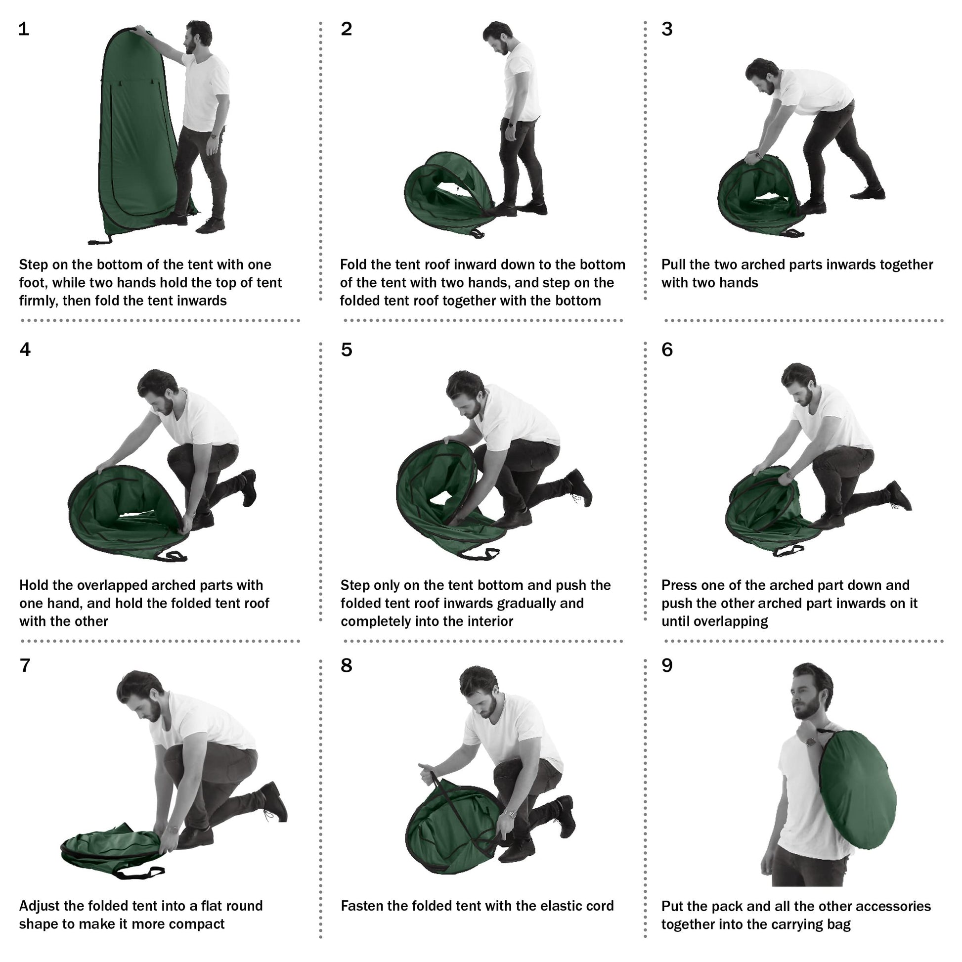 - POP UP INSTALLATION - This tent automatically pops open in seconds with no assembly required. The dual-sided zippered door of this portable shower tent can be shut for privacy or rolled and held open with the attached loop and toggles.