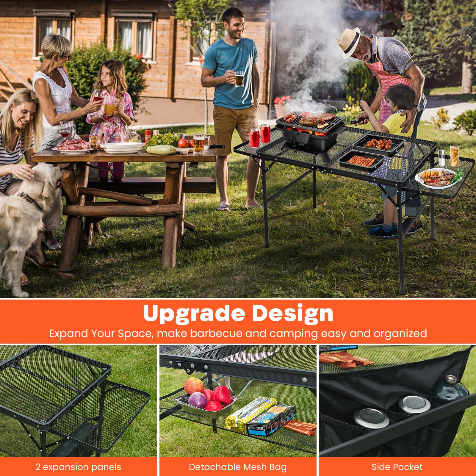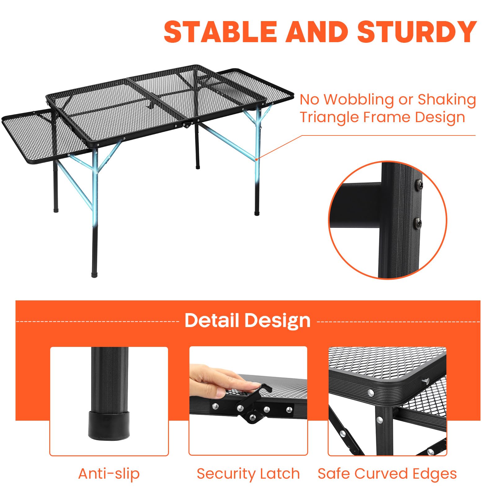 - 【Multipurpose Durability】 With a premium aluminum frame and sturdy iron mesh tabletop, this camping table is built to withstand heat and water, making it suitable for grills, camp stoves, and BBQ equipment. A true portable grill table for all your outdoor adventures, it combines strength and versatility for a reliable outdoor cooking experience