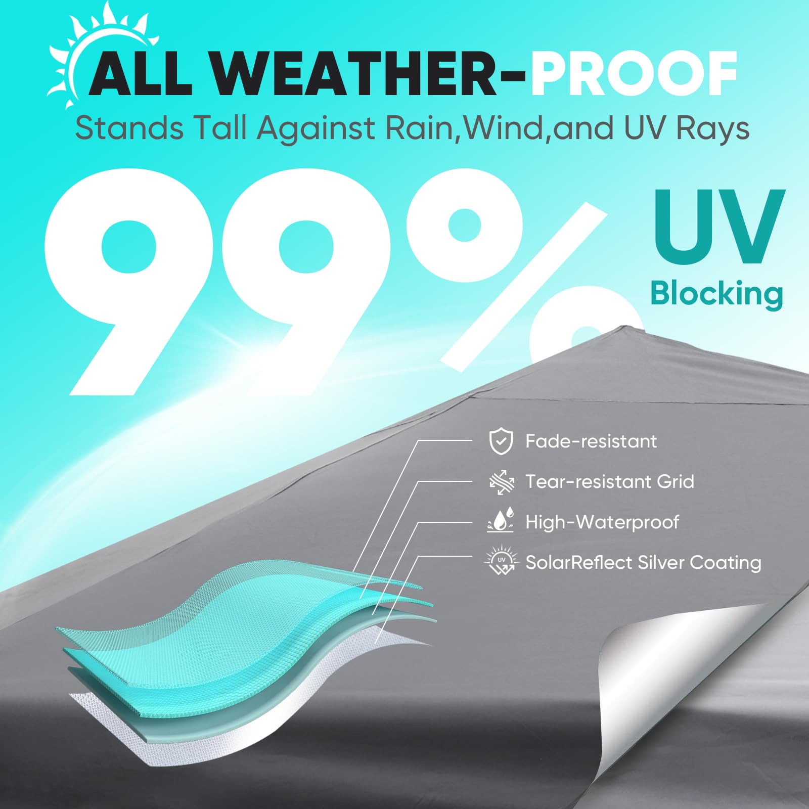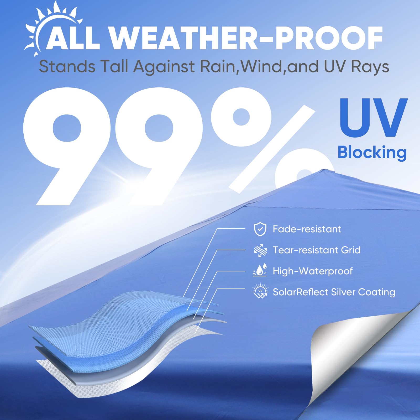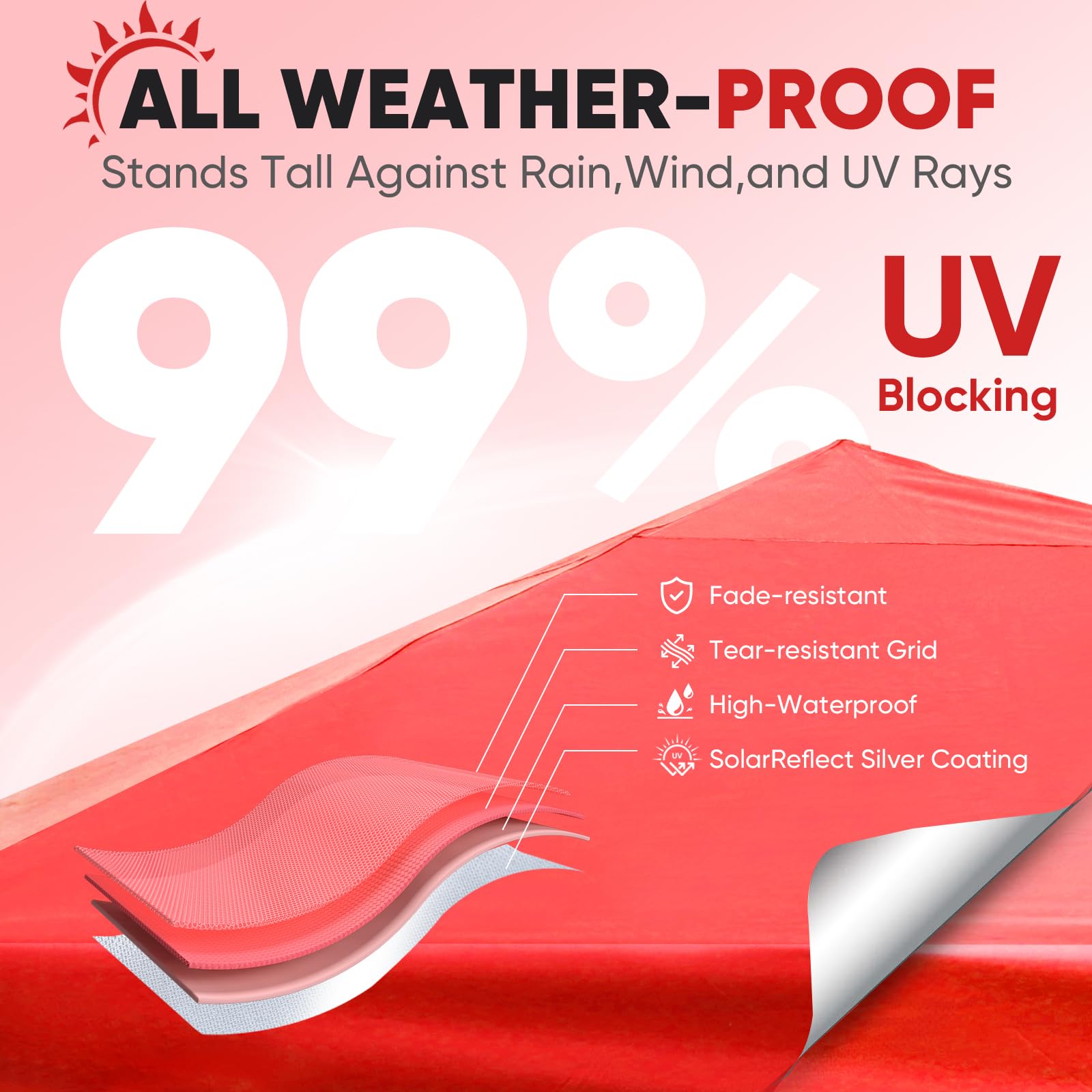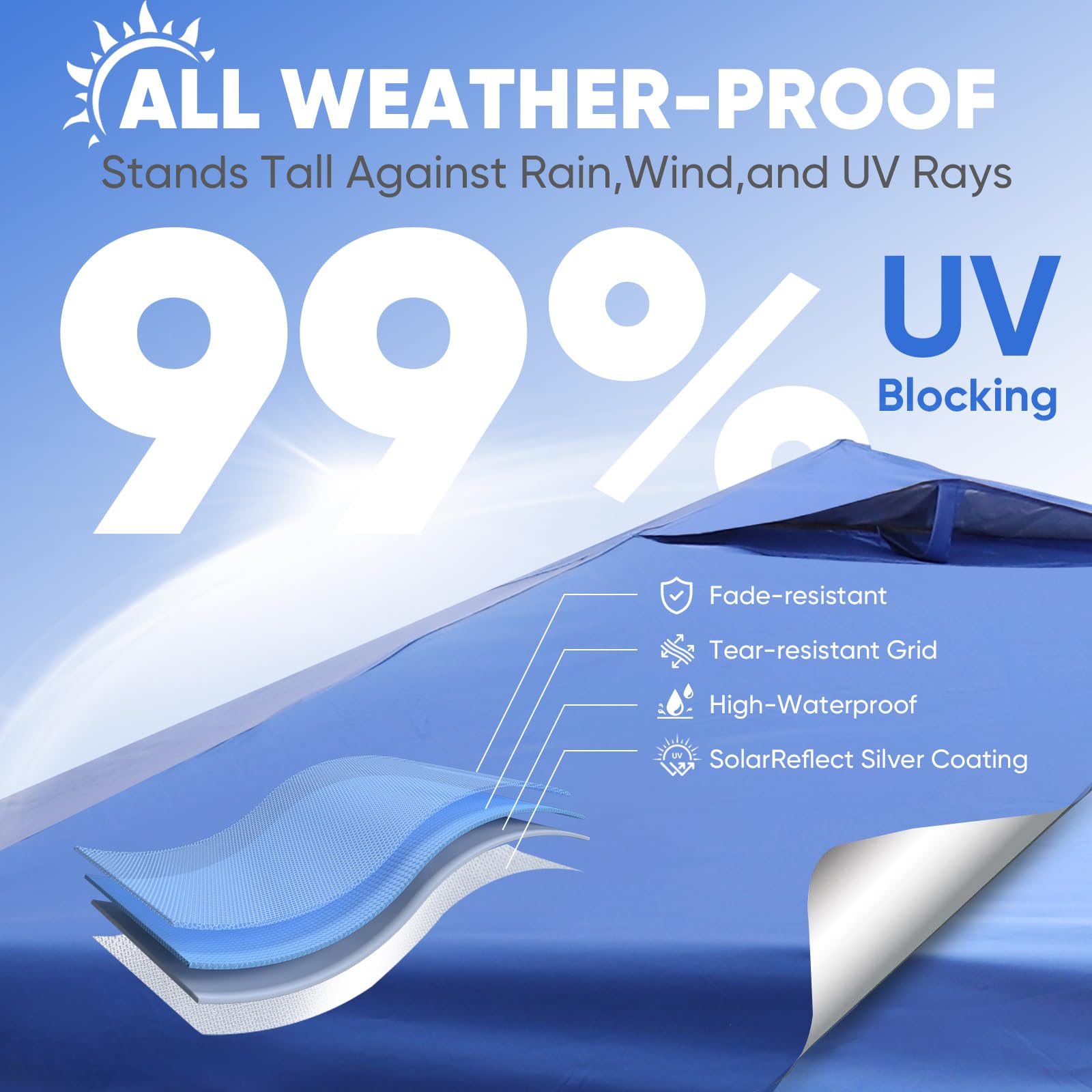 - ๐๐๐๐๐๐ ๐๐๐ ๐๐๐๐๐: Fade-resistant ๐ฐ๐ฎ๐ฌ๐ oxford fabric with ๐๐ถ๐น๐๐ฒ๐ฟ ๐ฐ๐ผ๐ฎ๐๐ถ๐ป๐ด, ๐จ๐ฃ๐ ๐ฑ๐ฌ+ fabric blocks 99% of UV rays, handles ๐ญ๐ฑ๐ฌ๐ฌ๐บ๐บ ๐๐ฎ๐๐ฒ๐ฟ ๐ฝ๐ฟ๐ฒ๐๐๐๐ฟ๐ฒ. Featuring carbon steel frame for unmatched durability. Made to offer lasting shade, year after year.