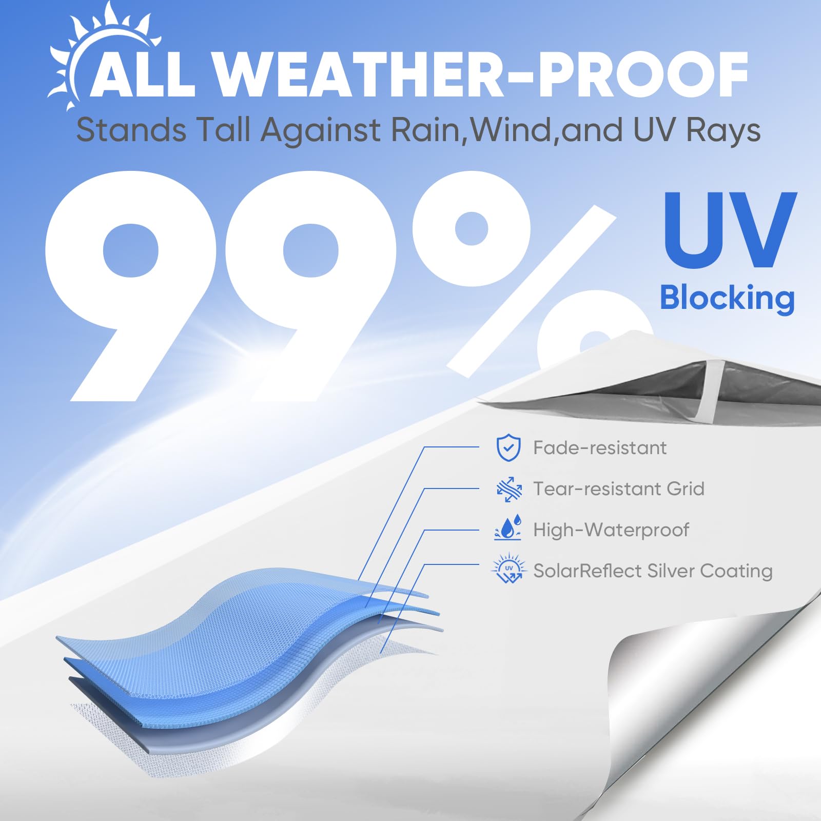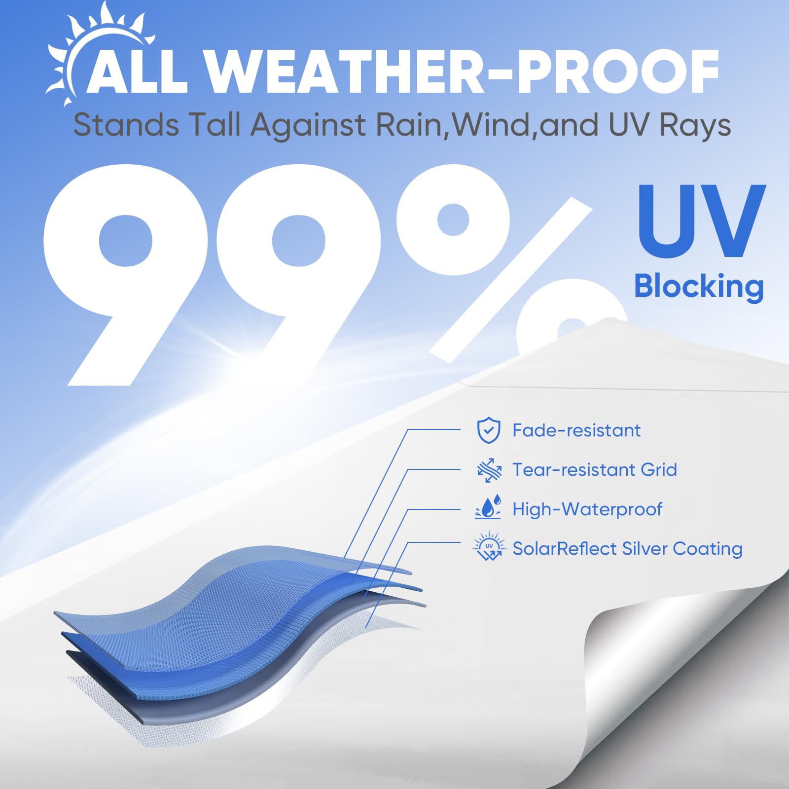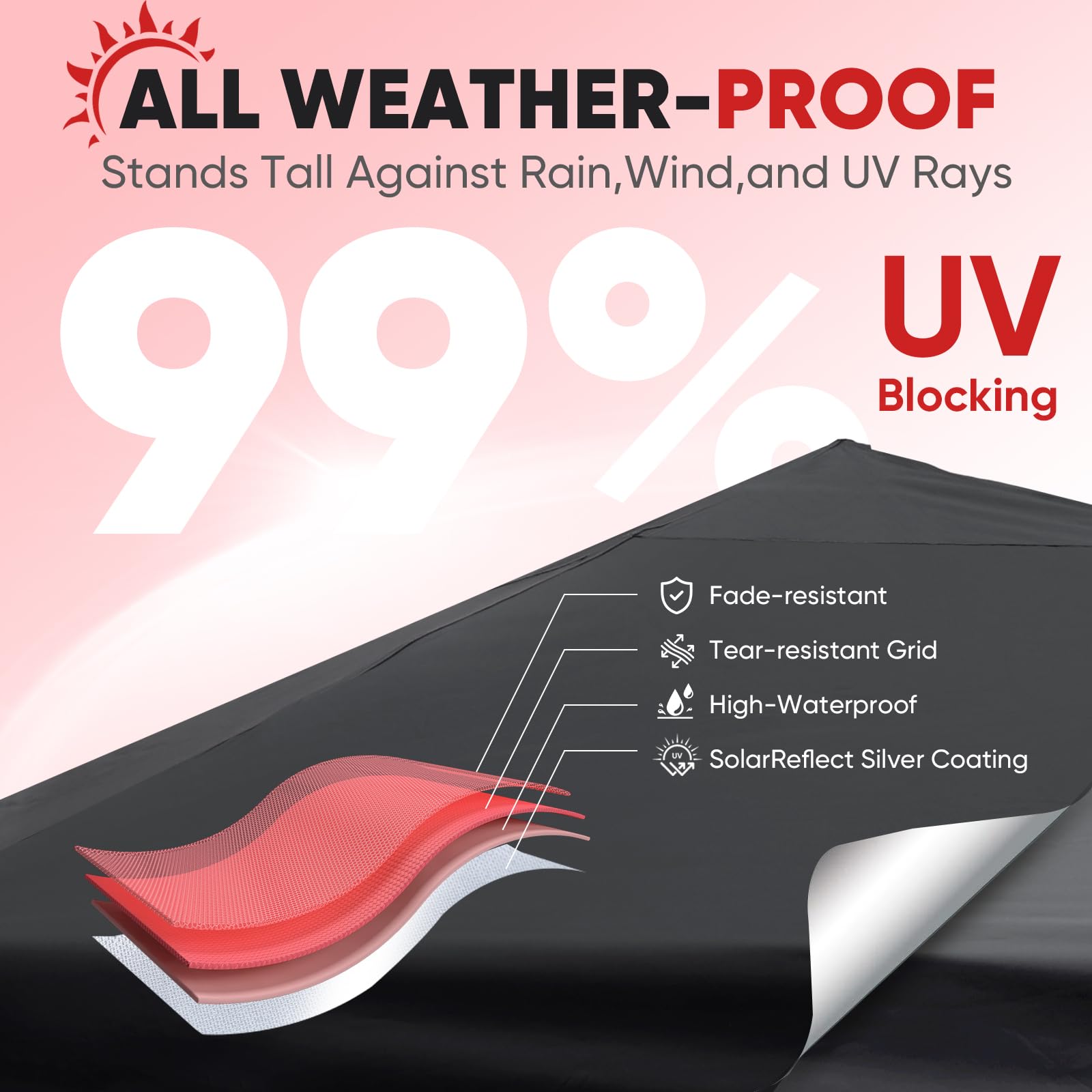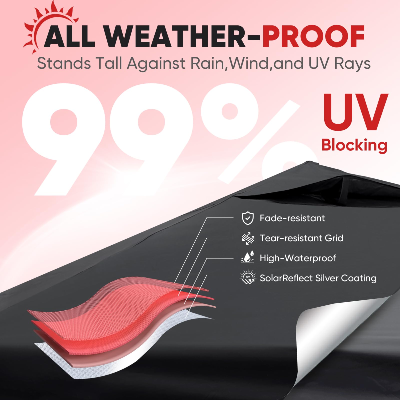 - ๐๐๐๐๐๐ ๐๐๐ ๐๐๐๐๐: Fade-resistant ๐ฐ๐ฎ๐ฌ๐ oxford fabric with ๐๐ถ๐น๐๐ฒ๐ฟ ๐ฐ๐ผ๐ฎ๐๐ถ๐ป๐ด, ๐จ๐ฃ๐ ๐ฑ๐ฌ+ fabric blocks 99% of UV rays, handles ๐ญ๐ฑ๐ฌ๐ฌ๐บ๐บ ๐๐ฎ๐๐ฒ๐ฟ ๐ฝ๐ฟ๐ฒ๐๐๐๐ฟ๐ฒ. Featuring carbon steel frame for unmatched durability. Made to offer lasting shade, year after year.