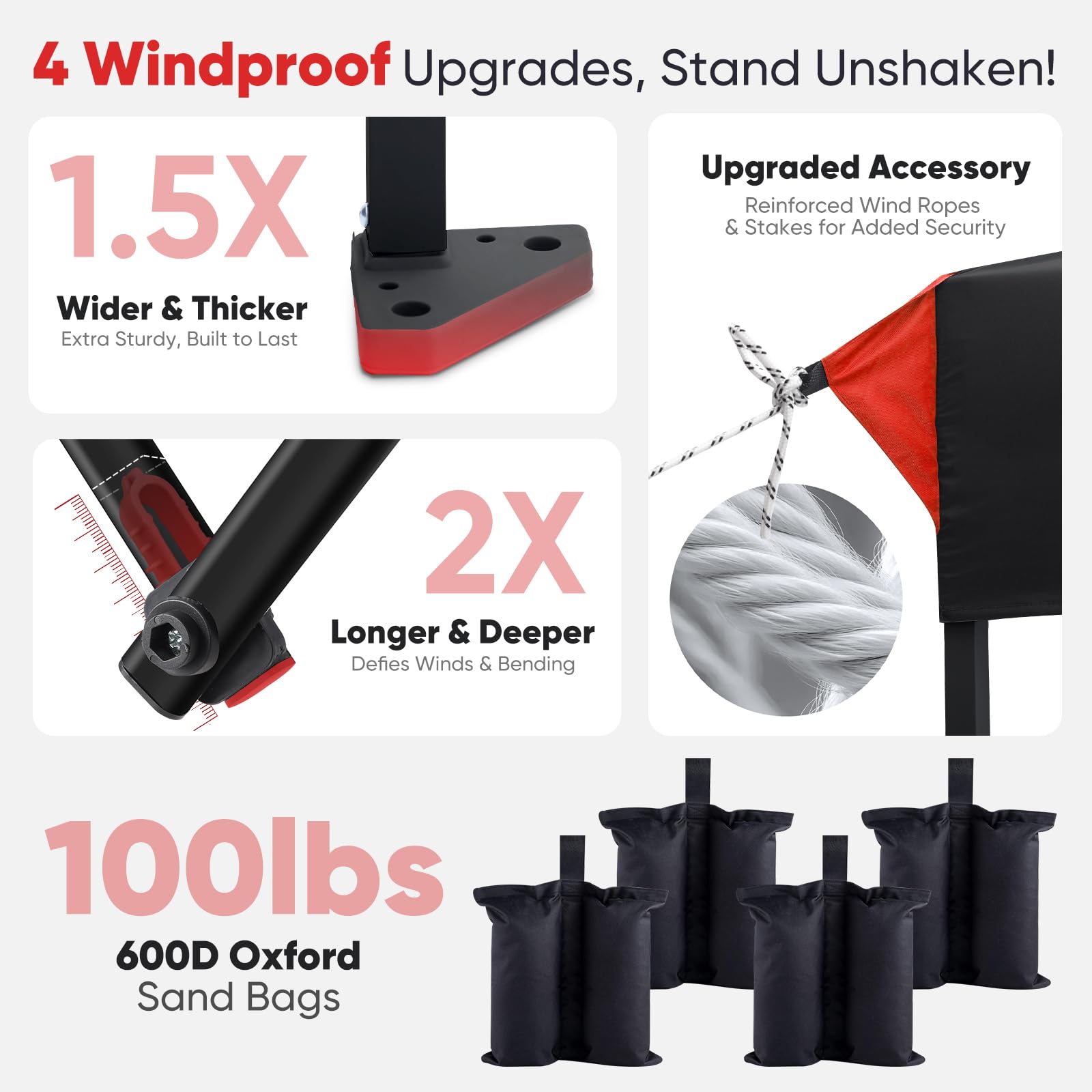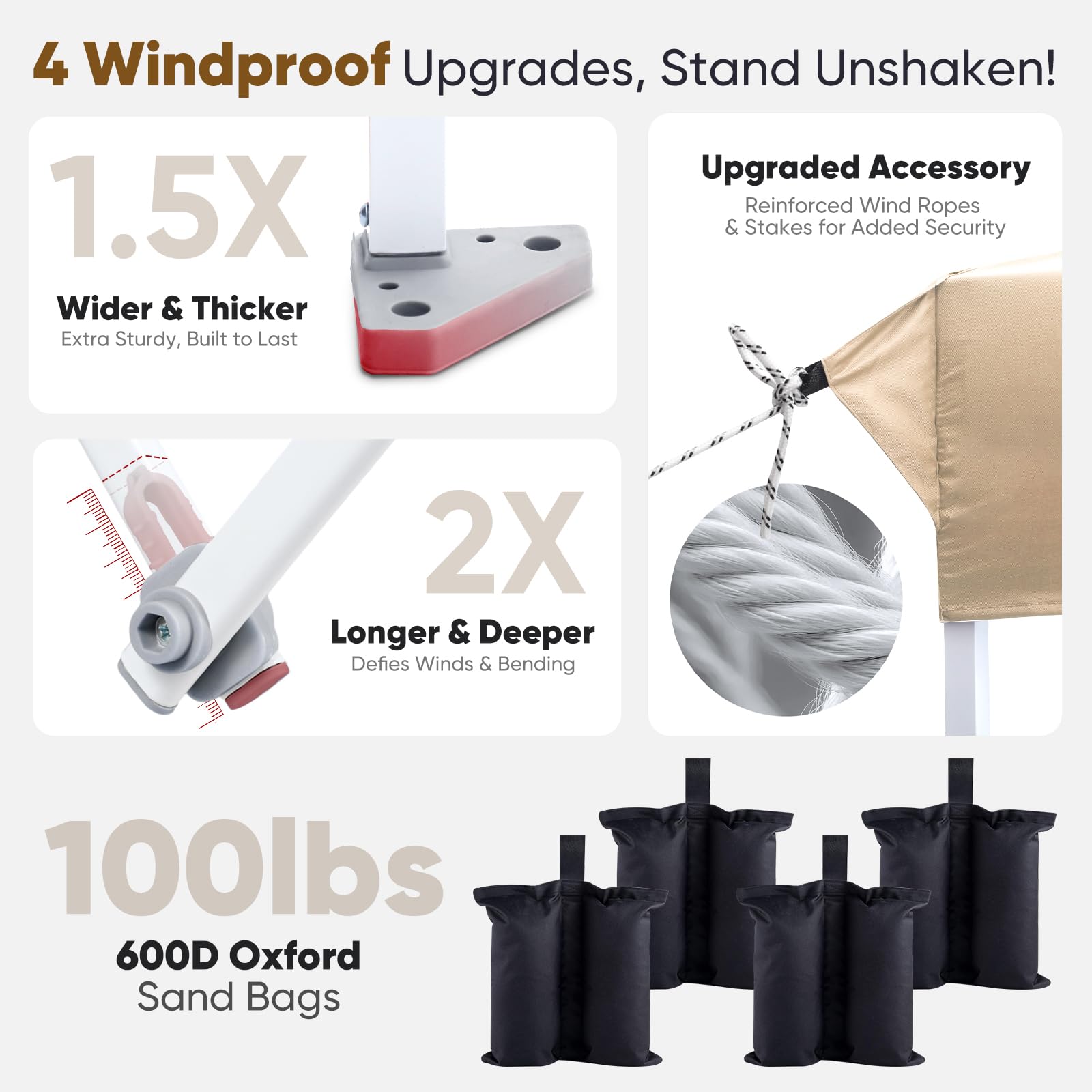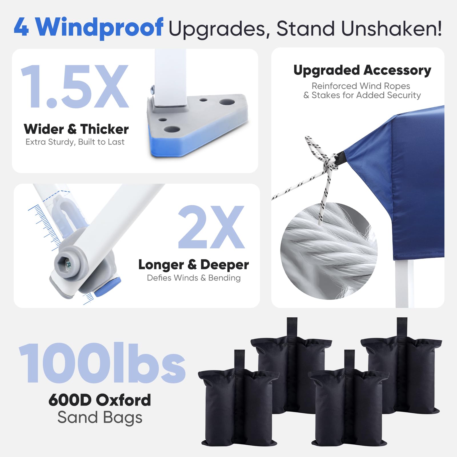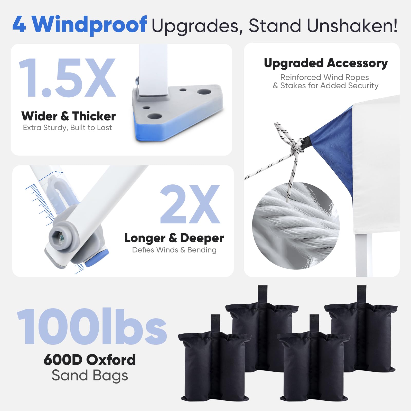 - ๐๐๐๐๐๐ & ๐๐๐๐๐๐: Sandbags hold ๐ญ๐ฌ๐ฌ๐น๐ฏ๐ for added stability, ๐ญ. ๐ฑ๐ ๐๐ถ๐ฑ๐ฒ๐ฟ footpads for a solid base, ๐ฎ๐ ๐ฑ๐ฒ๐ฒ๐ฝ๐ฒ๐ฟ crossbar joints to resist bending, and 4 wind ropes & 8 stakes for extra security. Perfect for everyday outdoor adventures!