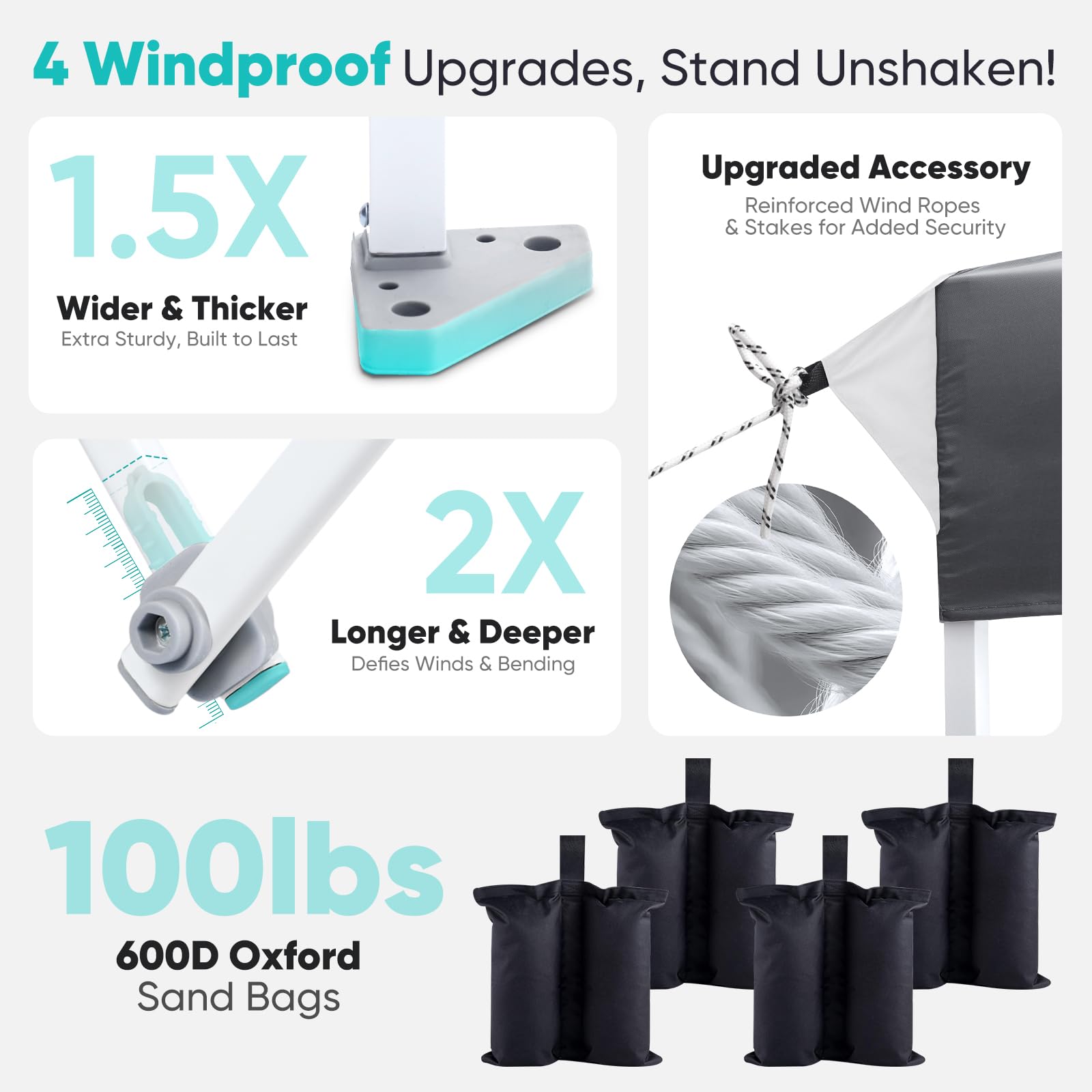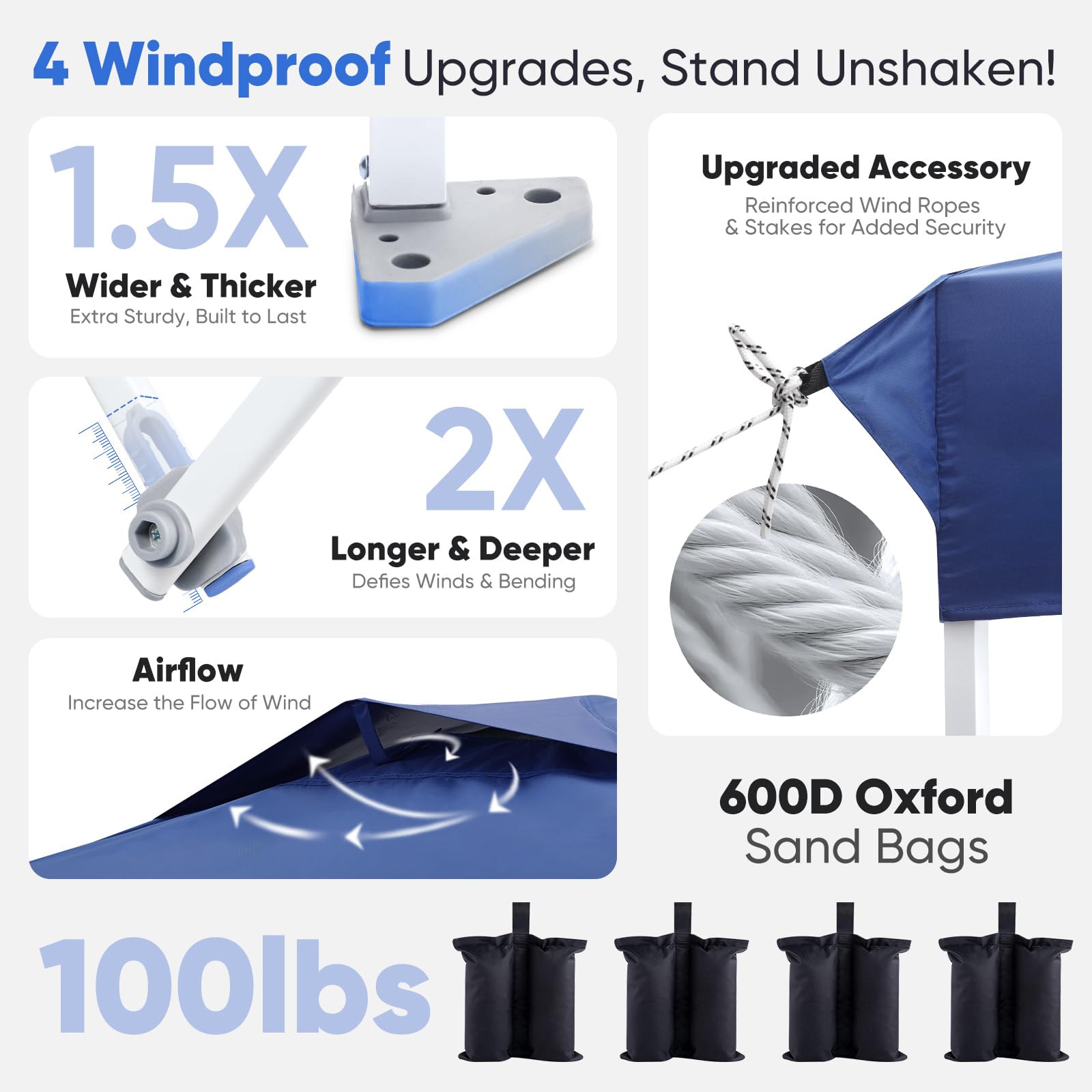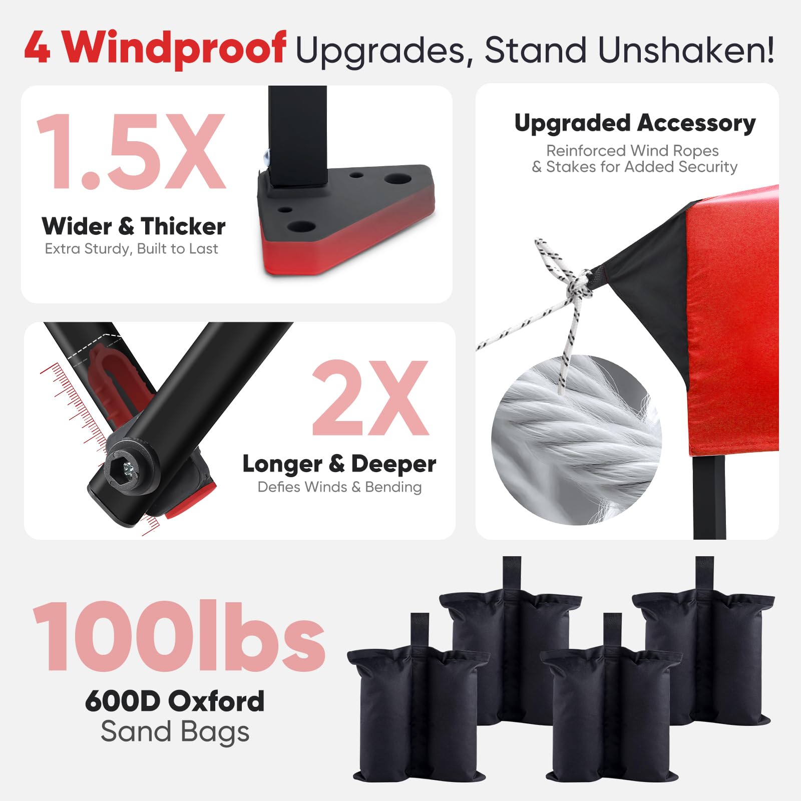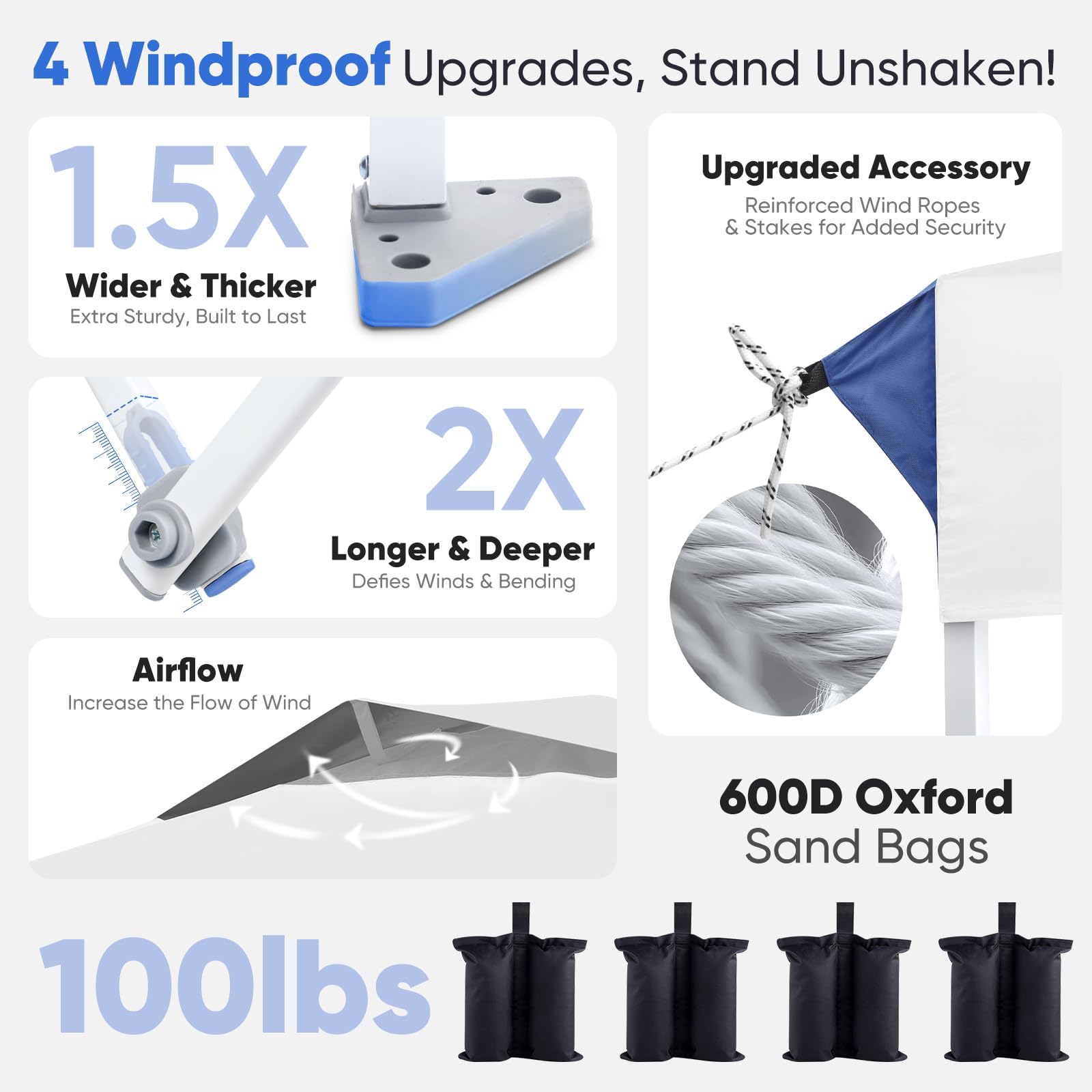 - ๐๐๐๐๐๐ & ๐๐๐๐๐๐: Sandbags hold ๐ญ๐ฌ๐ฌ๐น๐ฏ๐ for added stability, ๐ญ. ๐ฑ๐ ๐๐ถ๐ฑ๐ฒ๐ฟ footpads for a solid base, ๐ฎ๐ ๐ฑ๐ฒ๐ฒ๐ฝ๐ฒ๐ฟ crossbar joints to resist bending, and 4 wind ropes & 8 stakes for extra security. Perfect for everyday outdoor adventures!