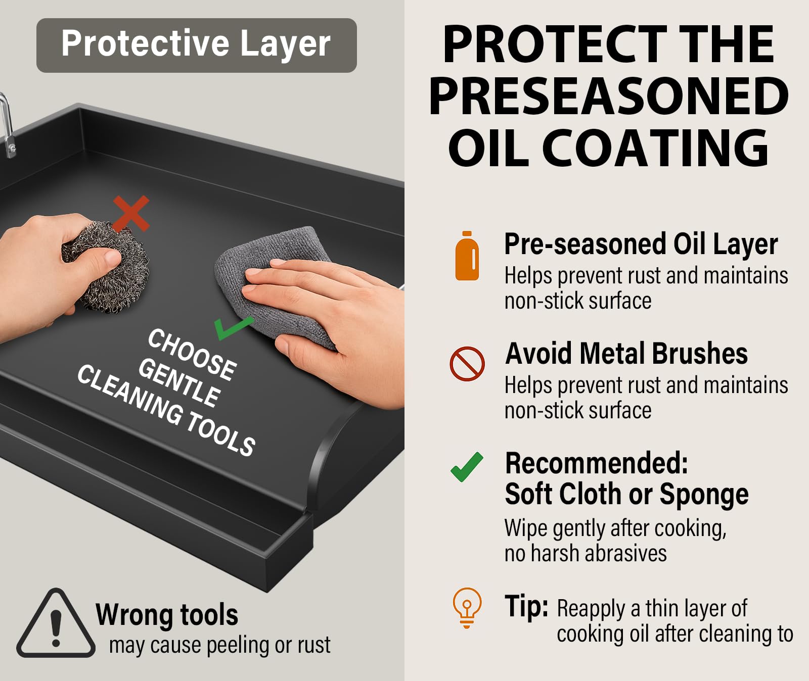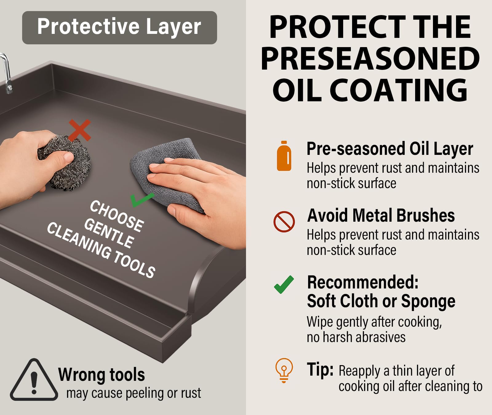 - 【How to Avoid Rust?】(1) Make sure that you scrape your griddle after each use; (2) Brushing with oil or spray before /after each use; (3) Condensation does not collect in the griddle; (4)If you need to store your grill for a long period of time, heavily coat them in cooking oil, wrap them in a plastic bag and store it on dry space